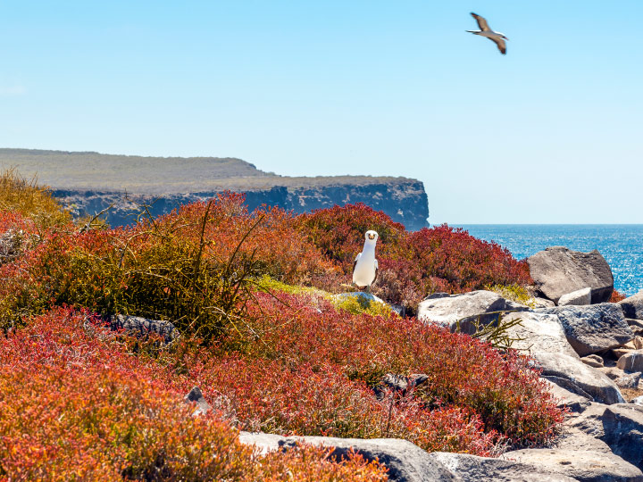 In the afternoon, head to South Plazas, one of the twin islands, where the northern sibling is reserved for scientific research. This small islet teems with wildlife; Galápagos land iguanas greet you from beneath the prickly-pear cacti, eager for their fruit. The island is alive with sea lions, showcasing their social dynamics, from playful pups splashing in tidal pools to protective males guarding their territories. Your trail leads to a breathtaking cliffside vantage point, offering views of seabirds like frigatebirds, red-billed tropicbirds, boobies, swallow-tailed gulls, and pelicans soaring above. The island's unique character is enhanced by a lush carpet of reddish succulents interspersed with scattered cacti, making South Plazas a truly captivating destination.