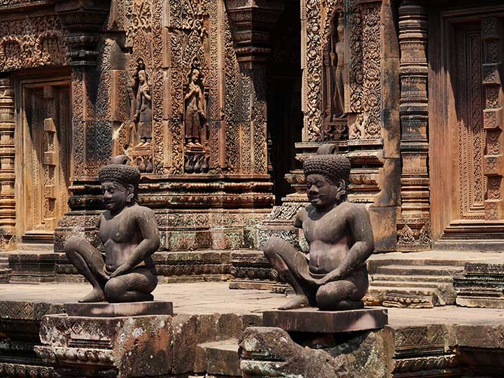 Today is focused on temples. Our first stop is a temple poetically known as the “Citadel of Women,” and dedicated to the Hindu god Shiva. The Banteay Srei temple was built in the 10th century and is smaller than most in Angkor. However, its incredibly detailed carvings make it famous. Made from pink sandstone, the intricate reliefs are so finely cut that many consider them to be the finest stone carvings in the entire Angkor region. Interestingly, it wasn’t built by a monarch but by two royal scholars and courtiers who served as trusted advisors to King Rajendravarman II.