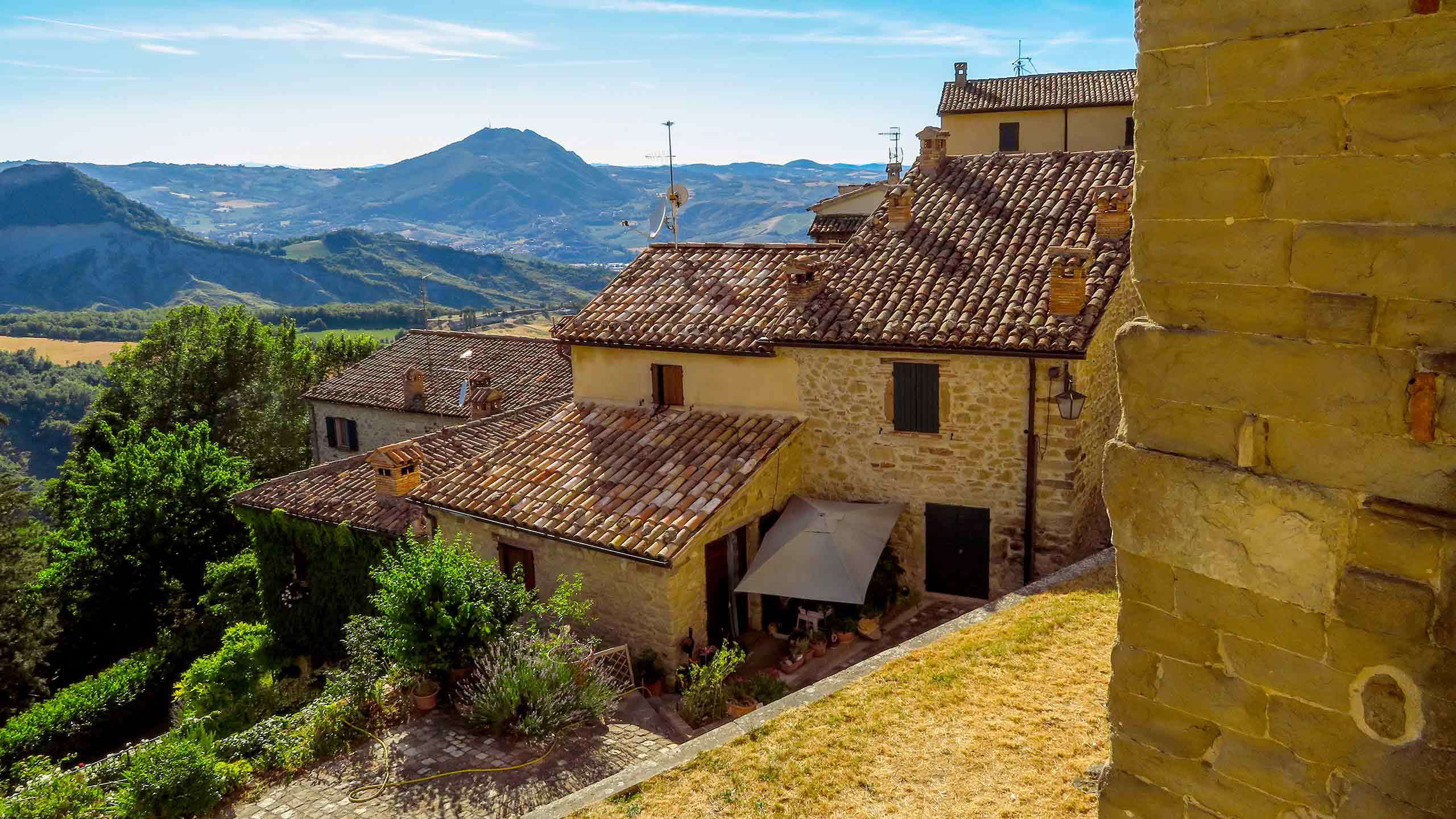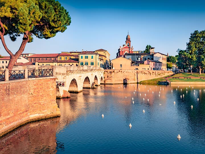 Our journey begins in Rimini, the hometown of legendary film director Federico Fellini. Before we set off, take a moment to admire the city's enduring Roman treasures, such as the magnificent Arch of Augustus and the ancient Tiberius Bridge, which has stood for two millennia. A short, pleasant ride then transports us to the charming medieval hilltop village of Santarcangelo di Romagna, where you can explore a labyrinth of fascinating tufa caves hidden beneath its streets.