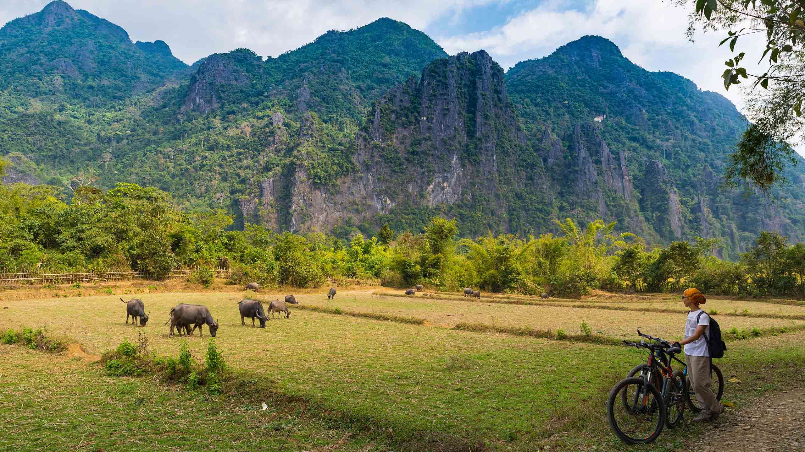 After arriving in Vang Vieng, begin your exploration by taking out the bikes. Spend your visit exploring this leisurely town, famed for its limestone karsts, secret caves, and neon-blue swimming holes, all by bike. The first stop for the day is the caves: gigantic and mysterious, with winding corridors full of stalagmites and stalactites. Equipped with a torch, delve deep into these natural time capsules carved out over millions of years. Next, return to the sunshine and take advantage of the Blue Lagoon to cool off. Here, swim, float, cannonball, or simply marvel at the view before trying a short climb for a full scenic panorama of the karst cliffs and river bends.