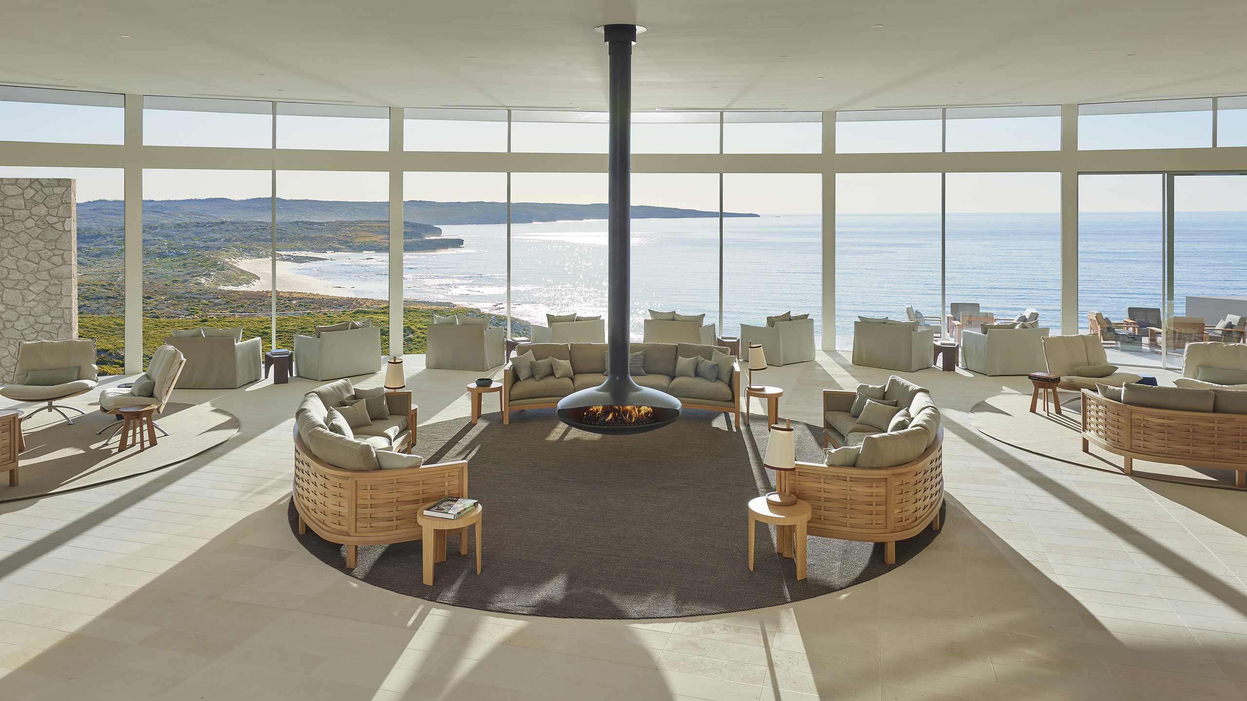 After the walk, unwind in the expansive Great Room, the heart of the lodge's activities. Whether you’re relaxing with a book while enjoying panoramic views of the Southern Ocean, sharing a drink at the open bar, or planning tomorrow’s adventures, this space offers the perfect retreat. Step outside to the terrace, where a wet-edge pool seamlessly blends into the surrounding landscape, offering an inviting spot to soak it all in. Inside, the lounge radiates warmth and comfort, complete with a self-serve open bar featuring South Australian craft beers, premium wines, and spirits. For wine enthusiasts, the walk-in cellar presents an exclusive selection of South Australian wines, many available only at the cellar door, making it a must-visit for an indulgent Kangaroo Island epicurean experience.