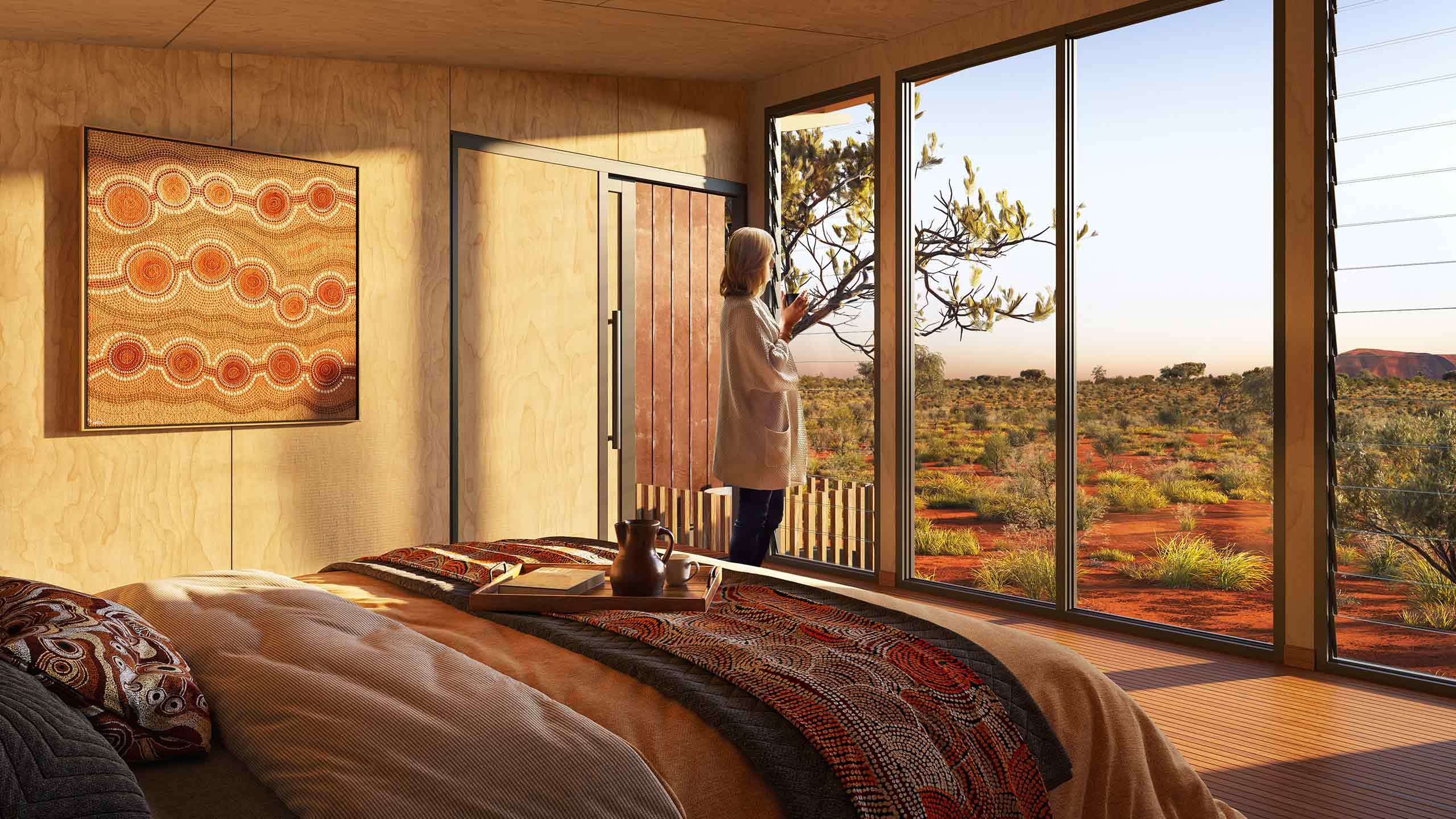 Night three and four at our Private Lodge will further boost relaxation levels: the lodge includes a Wellness Sanctuary where guests can book optional massages and refresh in the plunge tank with views out to Uluru. Communal spaces and bedrooms have been thoughtfully designed and meticulously crafted to amplify the surrounding scenes and touch the ground lightly.
